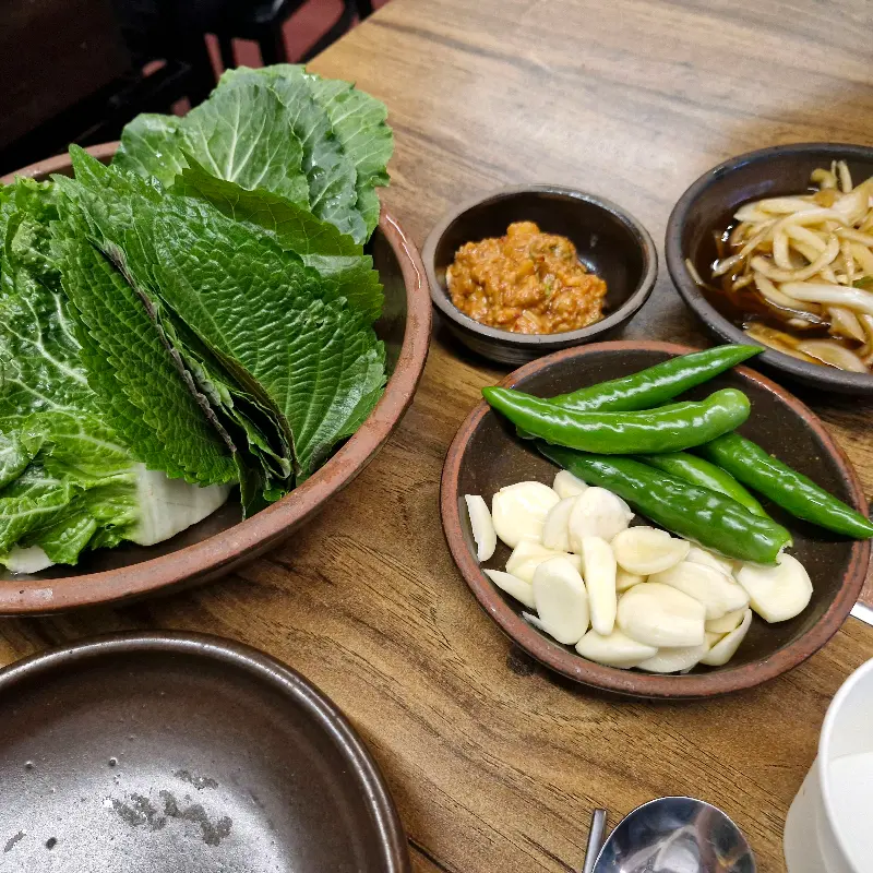싱싱한 쌈 채소에 오겹살과 쌈장, 마늘, 고추를 듬뿍 넣어 크게 한 쌈 싸 먹으니, 이번에는 다채로운 맛의 향연이 펼쳐졌다. 쌉싸름한 깻잎 향, 알싸한 마늘, 매콤한 고추가 오겹살의 풍미를 더욱 풍성하게 만들어 주었다. 쉴 새 없이 젓가락을 움직이며, 오겹살의 매력에 푹 빠져들었다.