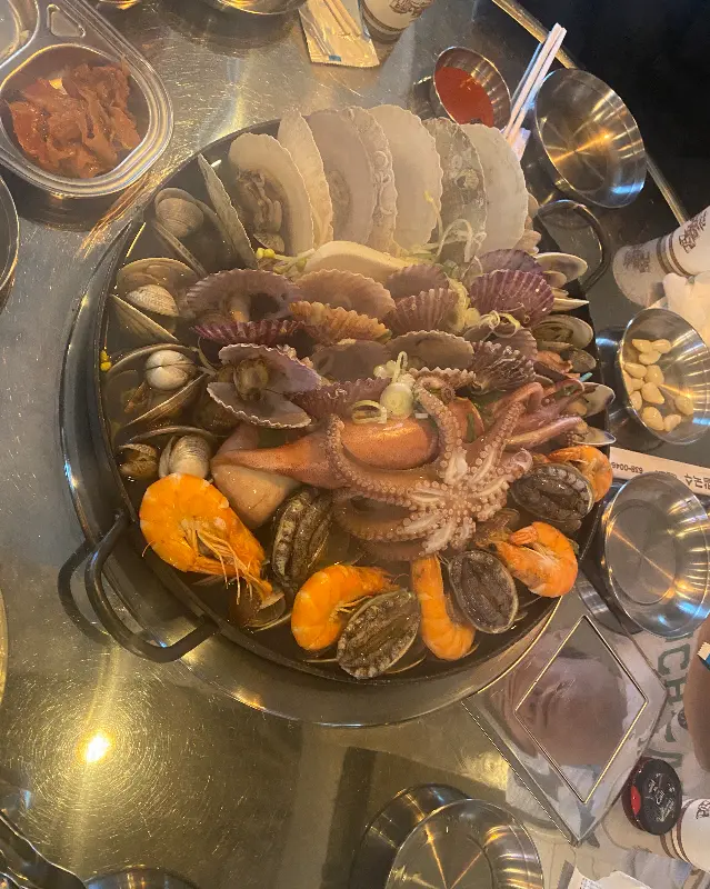 전골 냄비 안에는 가리비, 키조개, 전복, 새우, 오징어 등 싱싱한 해산물이 푸짐하게 담겨 있었다. 뽀얀 속살을 드러낸 가리비의 자태는 그야말로 황홀했고, 탱글탱글한 새우는 톡톡 터지는 식감을 예고하는 듯했다. 무엇보다 인상적이었던 것은 해산물의 신선도였다. 윤기가 자르르 흐르는 해산물을 보니, 이곳이 왜 천안 맛집으로 유명한지 단번에 알 수 있었다.