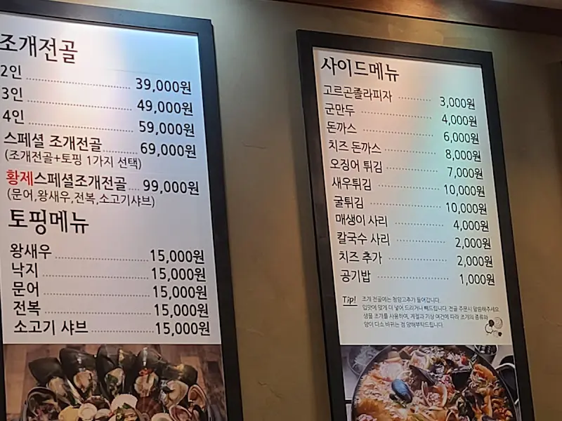 자리를 잡고 앉아 메뉴판을 펼쳐 들었습니다. 조개전골, 해물삼합 등 다양한 메뉴들이 눈에 들어왔지만, 저의 선택은 단연 조개찜이었습니다. 2인, 3인, 4인으로 구성된 조개전골 메뉴 외에도 스페셜, 황제 스페셜 조개전골 메뉴가 있었는데, 문어, 왕새우, 전복, 소고기 샤브까지 곁들일 수 있다는 설명에 잠시 마음이 흔들렸습니다. 하지만 오늘은 오롯이 조개 본연의 맛에 집중하고 싶었기에, 조개전골 2인으로 주문했습니다. 다음에는 꼭 황제 스페셜 조개전골을 맛보리라 다짐하며, 아쉬움을 달랬습니다.