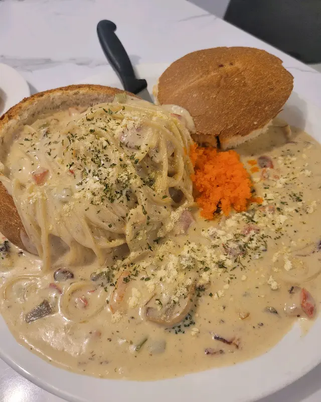 가장 먼저 눈에 띈 메뉴는 단연 빠네 크림 파스타였습니다. 빵 속에 담겨 나오는 파스타는 비주얼부터 압도적이었는데요. 빵을 뜯어 크림소스에 찍어 먹으니, 고소하면서도 부드러운 맛이 일품이었습니다. 특히 빵에 소스가 듬뿍 배어 있어, 마지막 한 조각까지 맛있게 먹을 수 있었어요. 가격은 13,900원으로, 넉넉한 양을 고려하면 가성비도 훌륭하다고 생각됩니다.