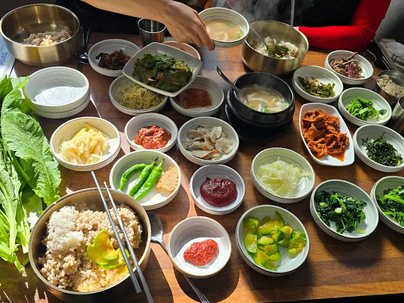 다음으로 시선을 사로잡은 것은 각종 나물들이었다. 깻잎, 취나물, 비름 등 제철 나물들은 하나같이 신선함이 느껴졌다. 특히 나물들의 향긋한 향은 피톤치드와 테르펜 덕분인데, 이는 스트레스 해소와 심신 안정에 도움을 준다. 3번 이미지에서 보이는 것처럼, 갓 지은 보리밥에 나물을 넣고 고추장을 살짝 넣어 비비니, 그야말로 꿀맛이었다.