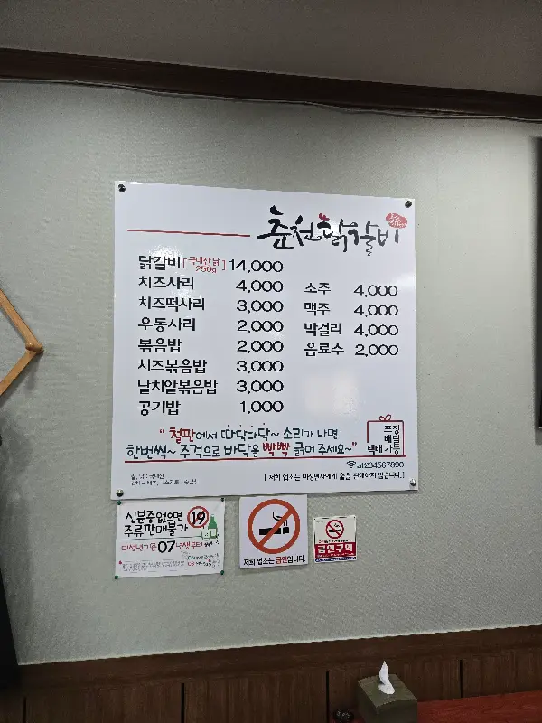 벽에 붙어있는 메뉴 사진들을 보니까, 닭갈비 말고도 다른 메뉴들도 꽤 있더라고. 다음에는 다른 메뉴들도 한번 먹어봐야겠다는 생각이 들었어. 특히 치즈 사리 추가해서 먹으면 진짜 맛있을 것 같아.