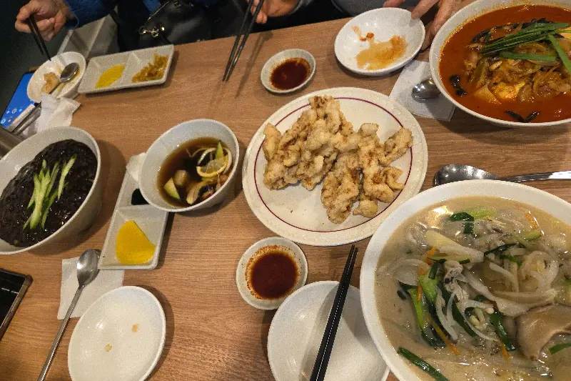 결정장애 발동한 나를 위해 친구가 나서서 탕수육이랑 짬뽕, 짜장면, 그리고 겨울 한정 메뉴라는 굴짬뽕까지 야무지게 시켜줬어. 역시 맛잘알 친구 덕분에 오늘도 맛있는 거 먹을 복 터졌네! 주문하고 나니까 따뜻한 자스민차를 내주시는데, 쌀쌀한 날씨에 몸이 사르르 녹는 기분이더라. 이런 섬세한 서비스, 완전 감동이야.