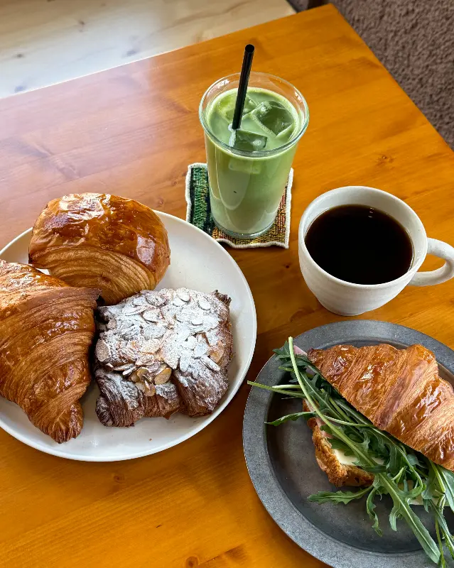 고민 끝에 뺑오쇼콜라와 말차라떼, 그리고 아메리카노를 주문했다. 쟁반에 담겨 나온 빵들은 사진으로 보던 것보다 훨씬 더 먹음직스러웠다. 특히 뺑오쇼콜라는 겹겹이 쌓인 페이스트리 결이 그대로 살아있어, 바삭한 식감을 기대하게 했다. 곁들여 나온 말차라떼는 녹차의 깊은 풍미와 부드러운 우유의 조화가 일품이었다. 에서 보았던 완벽한 조합 그대로였다.