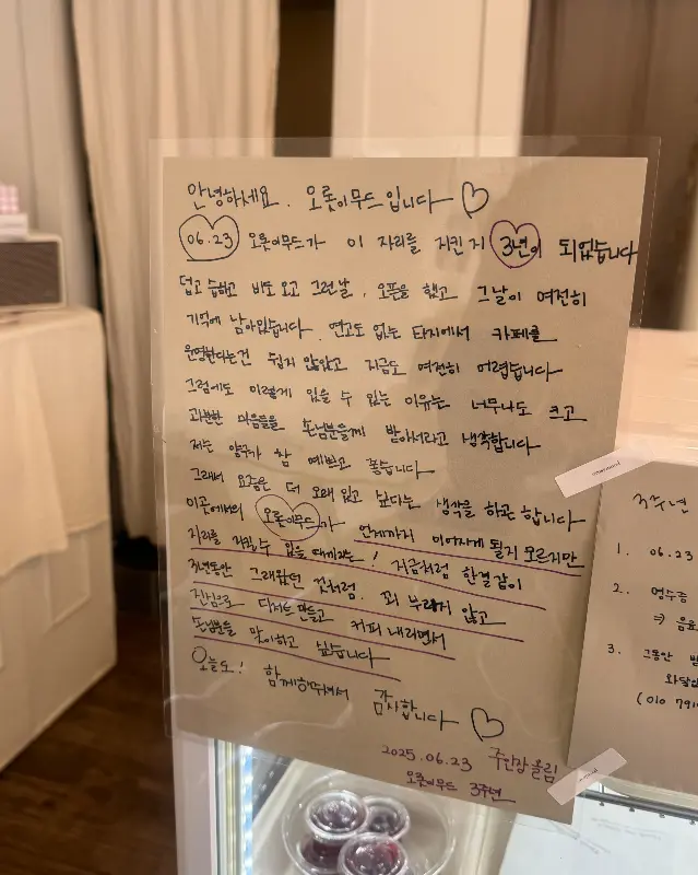 아, 그리고 오롯이무드는 3주년을 맞이했대! 오픈 때부터 꾸준히 방문했던 손님이 이제 수험생이 되었다는 이야기도 들려오더라. 그만큼 오랫동안 사랑받는 곳이라는 증거겠지? 나도 앞으로 오롯이무드의 단골손님이 될 것 같은 예감이 들어.