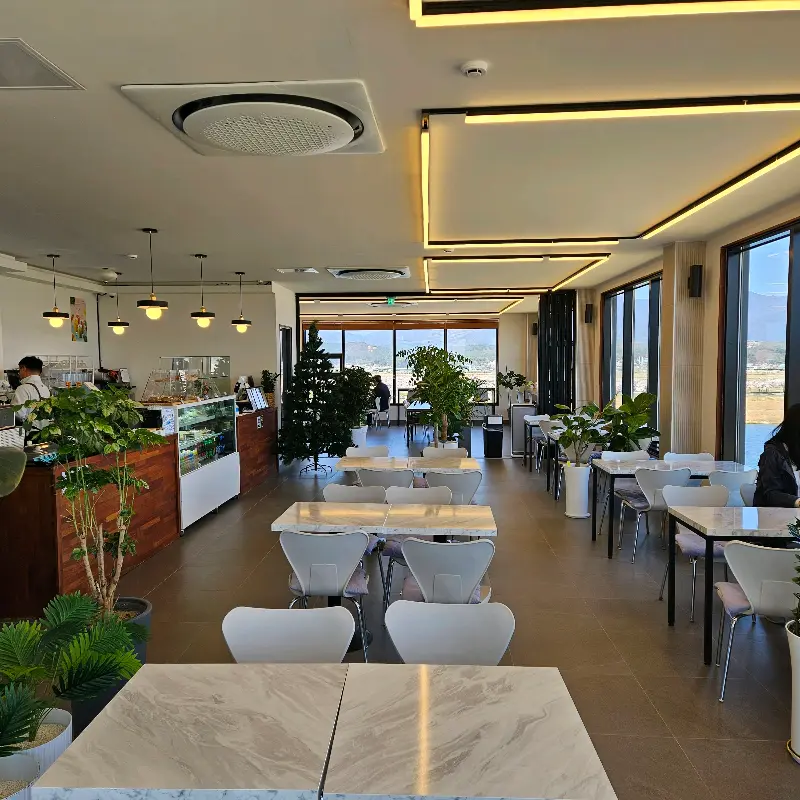 카페 내부는 넓고 깔끔했으며, 테이블 간 간격도 넉넉해서 편안하게 대화를 나누거나 혼자만의 시간을 보내기에 안성맞춤이었다. 은은한 조명과 곳곳에 놓인 푸른 식물들은 편안한 분위기를 더했다. 마치 갤러리에 온 듯한 느낌도 들었다. 나는 창가 자리에 앉아 메뉴판을 펼쳤다. 커피, 스무디, 에이드, 티, 그리고 다양한 디저트 메뉴들이 눈길을 사로잡았다.