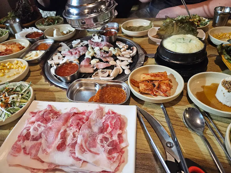 자리를 잡고 앉으니, 직원분께서 따뜻한 미소로 메뉴판을 건네주셨다. 뒷고기 전문점답게 뽈살, 덜미살 등 다양한 부위가 준비되어 있었다. 잠시 고민 끝에, 가장 인기 있다는 덜미살을 주문했다. 곁들여 먹을 묵은지 도시락과 시원한 국수도 함께 시켰다. 주문을 마치자, 푸짐한 밑반찬들이 테이블을 가득 채웠다. 샐러드부터 시작해서 묵은지, 쌈무, 쌈 채소 등 하나하나 정성이 느껴지는 맛깔스러운 반찬들이었다. 특히, 갓 구워져 나온 따끈한 계란찜은 부드러운 식감과 담백한 맛으로 입맛을 돋우기에 충분했다.