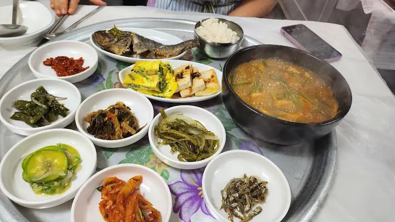 자리를 잡고 앉아 메뉴판을 살펴보니, 김치찌개, 된장찌개, 청국장, 제육볶음 등 익숙한 이름들이 눈에 들어왔다. 하나같이 내가 좋아하는 메뉴들이라 고민 끝에 김치찌개를 주문했다. 잠시 후, 테이블 위로 푸짐한 반찬들이 하나 둘씩 놓이기 시작했다. 콩나물무침, 김치, 어묵볶음, 시금치나물 등 보기만 해도 군침이 도는 반찬들이었다. 마치 어머니가 차려준 듯한 정갈한 모습에 감동했다.