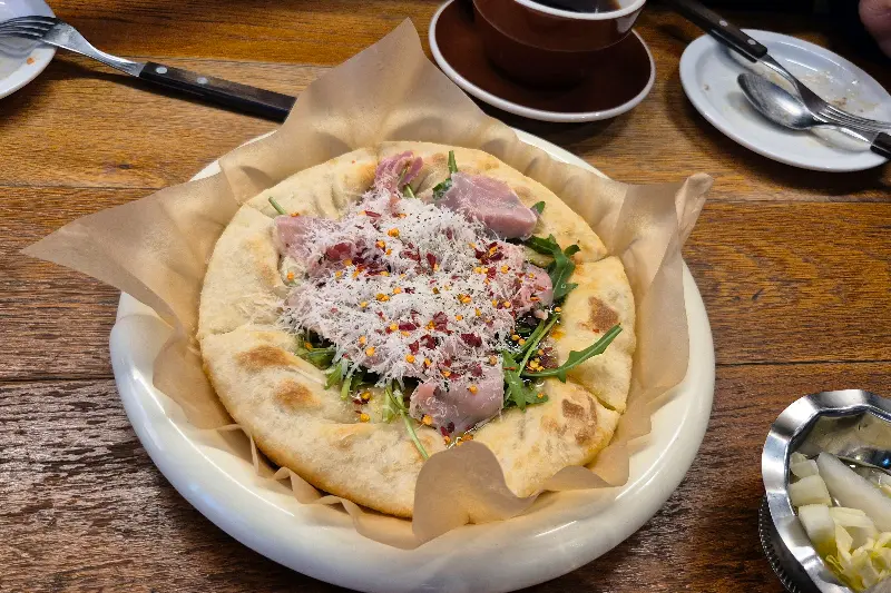 이미지들을 쭉 보니, 따뜻한 나무 테이블 위에 놓인 음식들의 향연이 다시금 떠오른다. 특히 뇨끼가 담긴 검은색 팬은 그 자체로도 식욕을 자극하는 비주얼! 샐러드와 피클이 담긴 은색 볼들은 반짝이는 조명 아래 더욱 시원하게 빛나고 있었다. 이런 디테일 하나하나가 어니스트식스티의 매력을 더하는 것 같다.