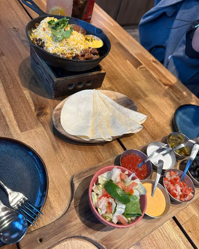 가장 먼저 등장한 것은 엘라토의 대표 메뉴, 파히타였다. 뜨겁게 달궈진 무쇠 팬 위에서 지글거리는 소리와 함께 풍성한 비주얼이 눈을 사로잡았다. 160도에서 마이야르 반응이 활발하게 일어난 듯, 먹음직스러운 갈색 크러스트가 고기 표면에 촘촘히 박혀 있었다. 윤기가 자르르 흐르는 새우, 촉촉하게 익은 소고기, 닭고기… 시각적인 아름다움만으로도 이미 미각은 최고조에 달했다.