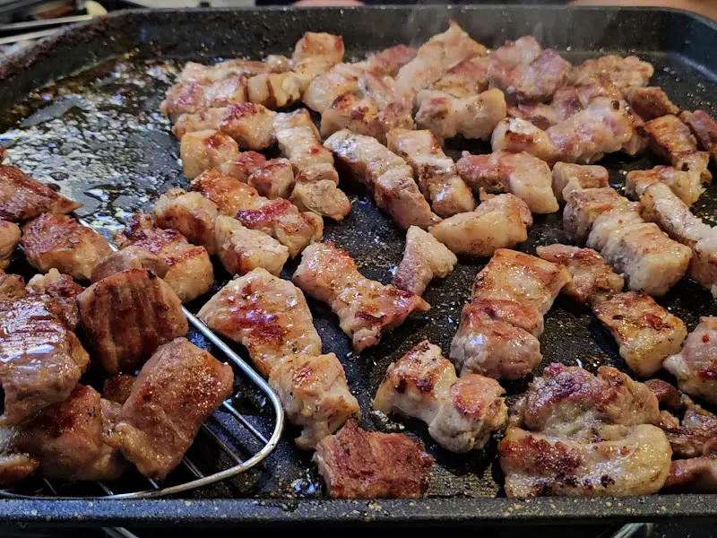 초벌된 삼겹살이 불판 위에서 지글거리는 모습