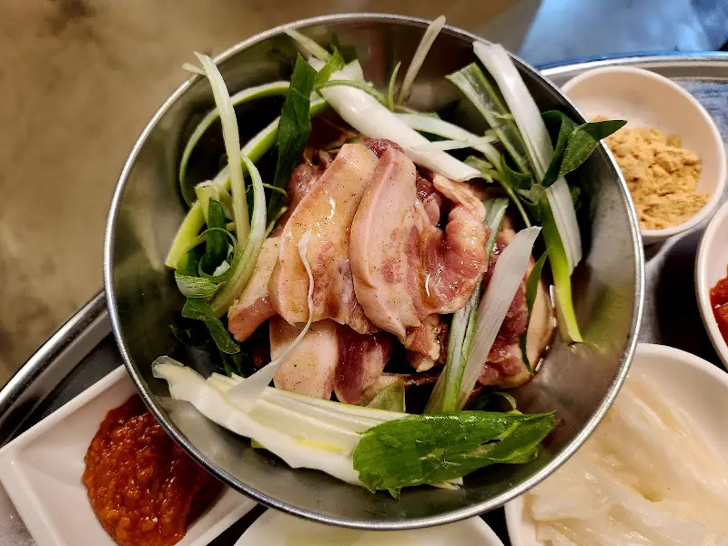 드디어 첫 점을 입에 넣는 순간, 감탄사가 절로 터져 나왔다. 쫄깃하면서도 부드러운 뽈살의 식감은 정말 환상적이었다. 잡내는 전혀 느껴지지 않았고, 고소한 육즙이 입안 가득 퍼져 나갔다. 특히 이곳만의 비법 파절임 소스에 찍어 먹으니, 그 맛이 배가 되었다. 매콤하면서도 달콤한 소스가 고기의 느끼함을 잡아주고, 파의 향긋함이 풍미를 더해줘 정말 꿀맛이었다. 와 3처럼, 불판 한켠에 놓인 소스에 고기를 살짝 담가 구워 먹으니, 시간이 지날수록 더욱 깊은 맛이 우러나왔다.