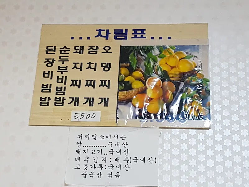 벽에 붙은 차림표를 살펴보니, 메인 메뉴인 돼지찌개, 순두부찌개, 오징어찌개 등이 모두 5,500원이라는 믿을 수 없는 가격에 판매되고 있었다. 마치 시간이 멈춘 듯한 착각이 들 정도였다. 게다가 밥은 밥솥에서 원하는 만큼 자유롭게 퍼먹을 수 있다니, 사장님의 푸짐한 인심에 다시 한번 감동했다. 요즘 물가에 5,500원으로 이렇게 든든한 한 끼를 해결할 수 있는 곳이 과연 얼마나 될까? 이건 정말 기적과도 같은 가격이다.