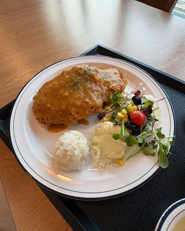 드디어 기다리고 기다리던 돈까스가 나왔다. 접시 가득 담긴 돈까스와 함께 샐러드, 밥, 그리고 따뜻한 스프까지. 마치 어릴 적 경양식 레스토랑에서 보던 바로 그 모습이었다. 돈까스 위에는 윤기가 자르르 흐르는 소스가 듬뿍 뿌려져 있었고, 샐러드에는 신선한 채소와 함께 콘샐러드가 곁들여져 있었다. 사진에서 보이는 것처럼, 돈까스 소스는 옅은 갈색을 띠고 있으며, 돈까스 튀김옷 위에 촉촉하게 스며들어 먹음직스러움을 더했다.