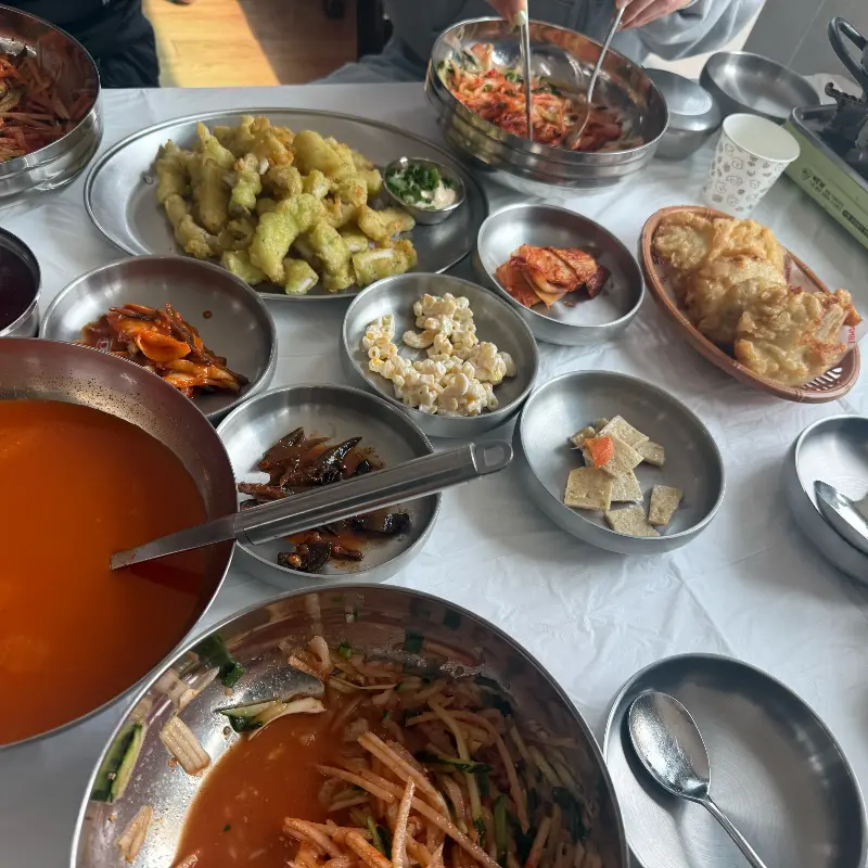 주문을 마치자마자, 테이블 위로 쉴 새 없이 깔리는 밑반찬들. 인심 한번 후하네! 콘 샐러드, 멸치볶음, 김치… 다채로운 라인업에 벌써부터 흥분되기 시작. 특히 눈에 띄는 건 바로 가자미 튀김! 겉은 바삭, 속은 촉촉한 이 완벽한 튀김의 조화, 에피타이저부터 심장 어택 당했잖아. 뜨끈한 매운탕 국물 한 모금 들이키니, 크으…! 온몸이 사르르 녹는 기분.