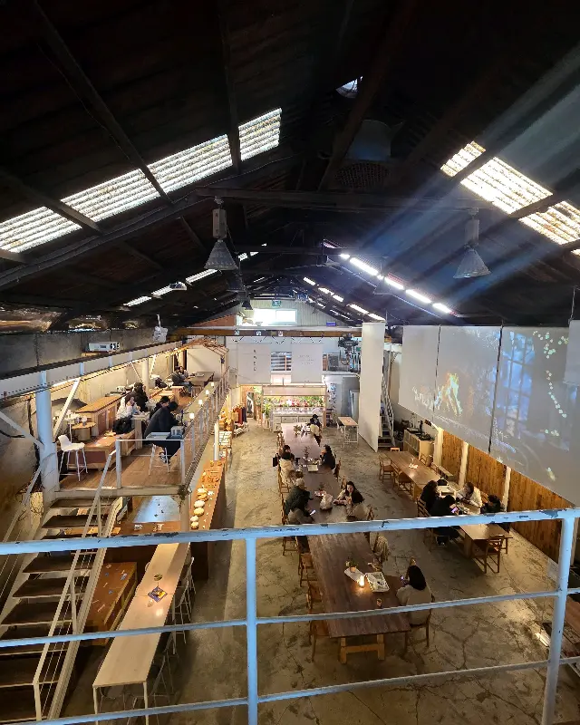 문을 열자마자 눈에 들어오는 건 높은 층고와 넓은 공간. 마치 공장을 개조한 듯한 인테리어가 힙스터 감성을 제대로 저격하잖아. 천장에는 앤틱한 조명이 은은하게 빛나고, 벽 한쪽에는 커다란 스크린이 설치되어 있어. 분위기, 장난 아니네. 마치 영화 속에 들어온 듯한 느낌적인 느낌?