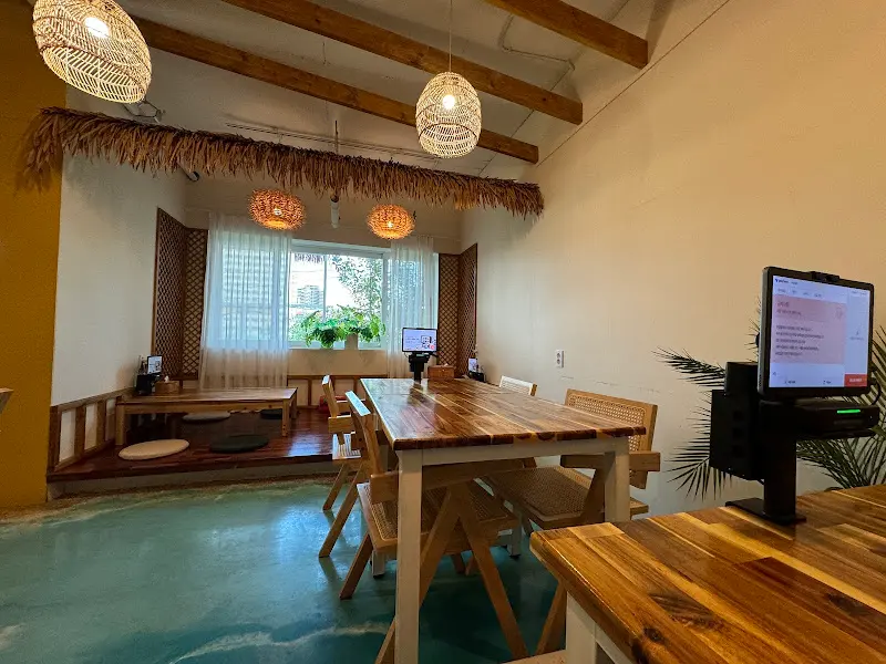 호기심을 억누르지 못하고 안으로 들어섰다. 문을 열자, 예상대로 아늑하고 이국적인 풍경이 펼쳐졌다. 나무 테이블과 의자, 라탄 소재의 조명, 그리고 은은하게 울려 퍼지는 하와이안 음악. 잠시나마 속초가 아닌 다른 세계에 온 듯한 착각이 들었다.