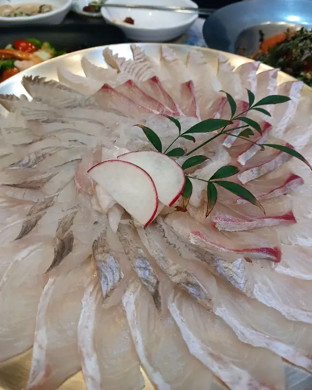 가장 먼저 눈에 들어온 것은 신선한 회였다. 광어, 도다리, 우럭 등 다양한 어종이 얇게 포를 떠서 올려져 있었다. 횟감 표면에는 섬세한 칼집이 들어가 있었는데, 이는 단순히 보기 좋게 하기 위함이 아니라 표면적을 넓혀 양념이 더 잘 배도록 하기 위한 과학적인 설계다. 실제로 회 한 점을 맛보니 입안에서 사르르 녹아내리는 듯한 식감과 함께 은은한 단맛이 느껴졌다.