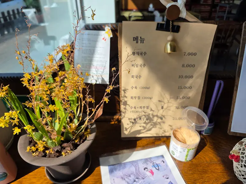 골프 약속 시간이 조금 남아, 간단하게 점심을 해결할 곳을 찾다가 발견한 곳이었다. 가게 문을 열고 들어서니, 테이블 간 간격이 넉넉해서 혼자 온 나도 편안하게 자리를 잡을 수 있었다. 나무로 된 메뉴판에는 멸치국수, 비빔국수, 회국수 등 다양한 국수 메뉴들이 적혀 있었다. 메뉴판 옆에 놓인 작은 종에 적힌 가격은 요즘 물가를 생각하면 꽤나 합리적이었다. 나는 멸치국수를 주문했다.