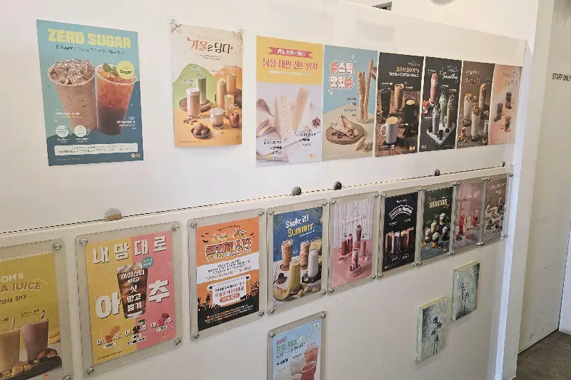 가게 문을 열자 은은한 커피 향이 코끝을 간지럽혔다. 아담한 공간은 햇살이 잘 들어 아늑한 분위기를 자아냈다. 벽면에 걸린 메뉴 포스터들이 눈에 띄었다. 다채로운 색감과 그림들이 시선을 사로잡았다. 제로 슈거 음료부터, ‘내 맘대로 아이스 츕스’ 같은 재밌는 이름의 메뉴까지, 하나하나 구경하는 재미가 쏠쏠했다.