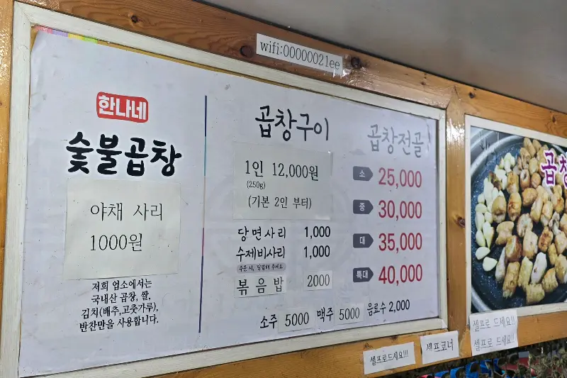 벽에 붙은 메뉴판을 보니 곱창구이 1인분에 12,000원, 전골은 25,000원부터 시작이네. 가격도 착해, 아주 칭찬해!