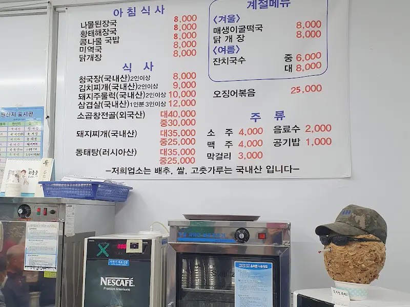 문을 열고 들어서니, 생각보다 넓고 깔끔한 내부가 눈에 들어왔어. 테이블마다 옹기종기 모여 앉아 식사하는 사람들의 모습에서 편안함이 느껴졌지. 메뉴판을 스캔하니, 나물된장국, 황태해장국 같은 정겨운 메뉴들이 8,000원 균일가! 갓성비 내려오네! 거기에 오징어볶음(25,000원), 돼지찌개, 닭볶음탕, 촌닭(능이)백숙, 옻닭 등 다양한 메뉴들이 침샘을 자극했어. 마치 할머니 집에 놀러 온 듯 푸근한 메뉴 라인업, 인정? 어 인정.