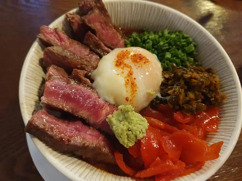 잠시 후, 기다리던 카레가 나왔다. 을 통해 미리 보았던 스테이크 카레의 모습은 실물로 보니 더욱 먹음직스러웠다. 윤기가 흐르는 스테이크와 반숙 계란, 그리고 형형색색의 채소들이 조화롭게 담겨 있었다. 밥과 카레는 1회 리필이 가능하다고 했다.