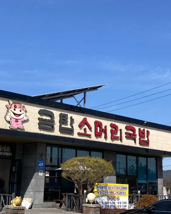 처음 식당 앞에 섰을 때, 가장 먼저 눈에 들어온 것은 밝고 큼지막한 간판이었습니다. ‘금탄소머리국밥’이라는 글자가 큼직하게 쓰여 있었고, 귀여운 소 그림이 곁들여져 있어 친근한 느낌을 주었습니다. 주변에 다른 식당들이 많지 않은 지역이라 더욱 눈에 띄었죠. ‘아침부터 점심까지 영업’이라는 안내 문구를 보니, 이른 아침이나 늦은 점심에도 부담 없이 들를 수 있겠구나 싶었습니다.