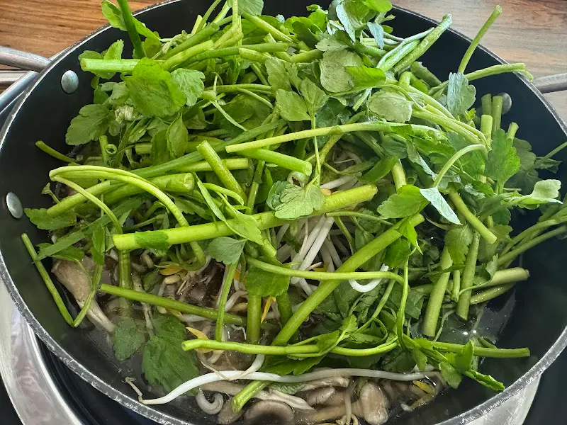 주문 후, 곧바로 테이블 위에는 샤브샤브를 위한 세팅이 시작되었다. 먼저 눈에 띈 것은 한약재 향이 은은하게 풍기는 육수였다. 보기만 해도 건강해지는 느낌이랄까. 육수가 끓기 시작하자, 직원분께서 신선한 채소와 얇게 썰린 고기를 가져다주셨다. 미나리를 듬뿍 넣어주시는 인심에 감동했다. 을 보면 알겠지만, 정말 미나리가 산처럼 쌓여 나온다. 싱그러운 초록색 미나리가 냄비 안을 가득 채우니, 보기만 해도 입안에 침이 고였다.