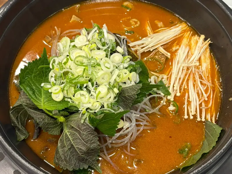 주문하고 얼마 지나지 않아, 드디어 기다리고 기다리던 감자탕이 등장했어. 냄비 가득 푸짐하게 담긴 비주얼에 입이 떡 벌어지더라. 얼큰한 국물 냄새가 코를 찌르는데, 진짜 참기 힘들었어. 깻잎이랑 팽이버섯, 송송 썰린 파가 듬뿍 올라가 있어서 더욱 먹음직스러워 보였어.