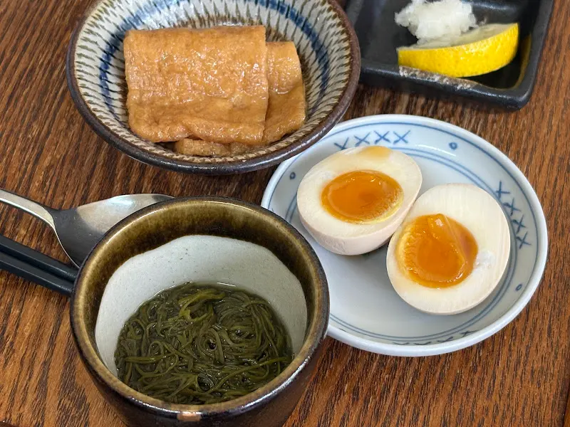특히 인상 깊었던 것은 유부조림이었습니다. 달달한 간장 맛이 깊게 배어 있는 유부는 담백한 국물과 환상적인 조화를 이루었습니다. 유부의 달콤함이 슴슴한 국물에 녹아들면서, 입안 가득 풍성한 맛이 퍼져나갔습니다. 반숙 계란 역시 빼놓을 수 없는 별미였습니다. 촉촉한 반숙 노른자를 톡 터뜨려 면과 함께 먹으니, 고소함과 부드러움이 입안 가득 퍼져나갔습니다.