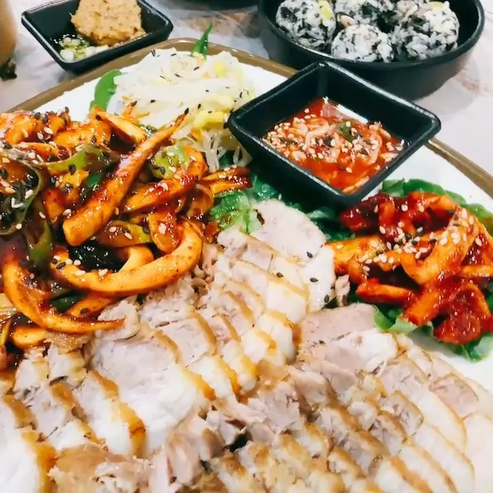 드디어 기다리고 기다리던 오징어보쌈이 모습을 드러냈다. 마치 잘 설계된 분자 모형처럼 완벽한 비주얼이었다. 윤기가 자르르 흐르는 보쌈, 붉은 양념에 버무려진 오징어, 그리고 곁들여진 콩나물무침까지. 색감의 조화가 시각적인 식욕을 자극했다. 이 순간, 뇌에서는 도파민이 폭발적으로 분비되기 시작했다.
