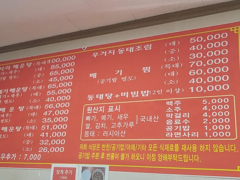 메뉴판을 스캔하듯 훑어봤다. 우거지 동태조림, 메기찜, 빠가찜 등 다양한 메뉴가 있었지만, 나의 최종 선택은 ‘메기 매운탕’. 민물 매운탕 특유의 깊은 맛을 제대로 느껴보고 싶었기 때문이다. 메뉴판 한켠에 적힌 원산지 표시를 보니, 쌀, 김치, 고춧가루까지 모두 국내산 재료를 사용한다고 한다. 재료에 대한 자부심이 느껴지는 대목이다.