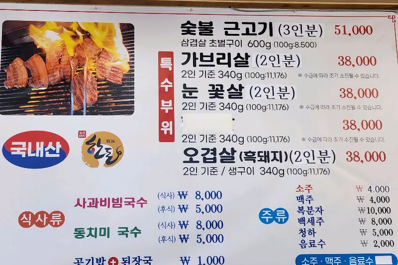 자리에 앉아 메뉴판을 살펴보니, 숯불 근고기, 꽃살, 오겹살 등 다양한 돼지고기 메뉴가 준비되어 있었다. 특히 눈에 띈 것은 ‘눈꽃살’이었다. 돼지 한 마리에서 500g밖에 나오지 않는 특수 부위라고 하니, 그 맛이 더욱 궁금해졌다. 고민 끝에 숯불 근고기와 눈꽃살을 1인분씩 주문했다. (아쉽게도 1인분씩 판매하지 않아, 양이 많을 것 같았지만, 맛있는 음식을 남길 수는 없었다.) 식사 메뉴로는 사과 비빔국수와 동치미 국수를 선택했다.