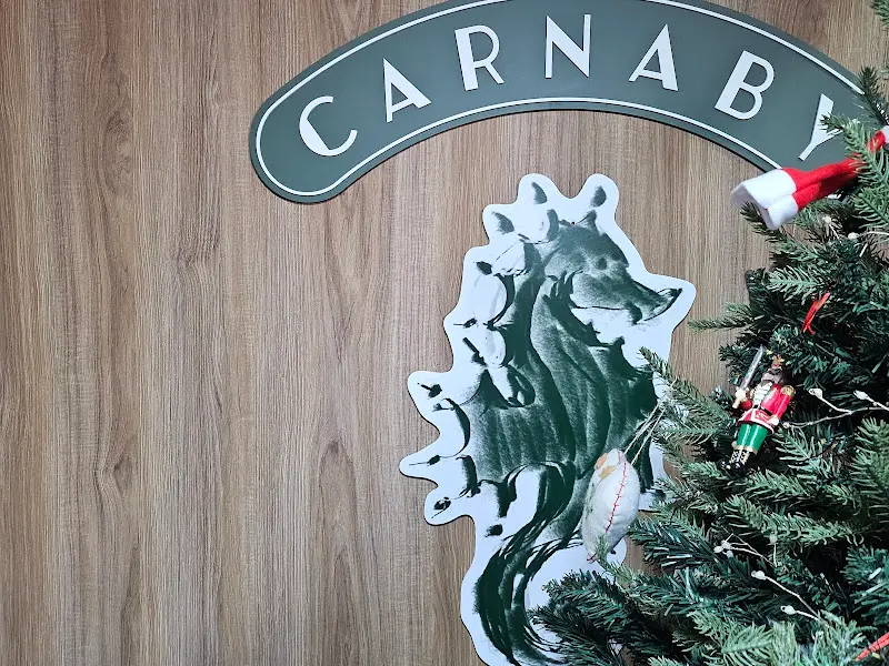 문을 열고 들어서는 순간, 은은하게 퍼지는 향긋한 아로마 향이 코끝을 간지럽혔다. 따뜻한 조명이 아늑한 분위기를 더했고, 흘러나오는 잔잔한 음악은 편안함을 선사했다. 벽 한쪽에는 “Korean Dining Carnaby 4F”라고 쓰인 칠판이 놓여 있어 이곳이 퓨전 한식 다이닝임을 알려주고 있었다. 짙은 녹색의 “CARNABY” 간판 아래에는 해마 그림과 크리스마스 장식이 어우러져 독특한 분위기를 자아냈다.