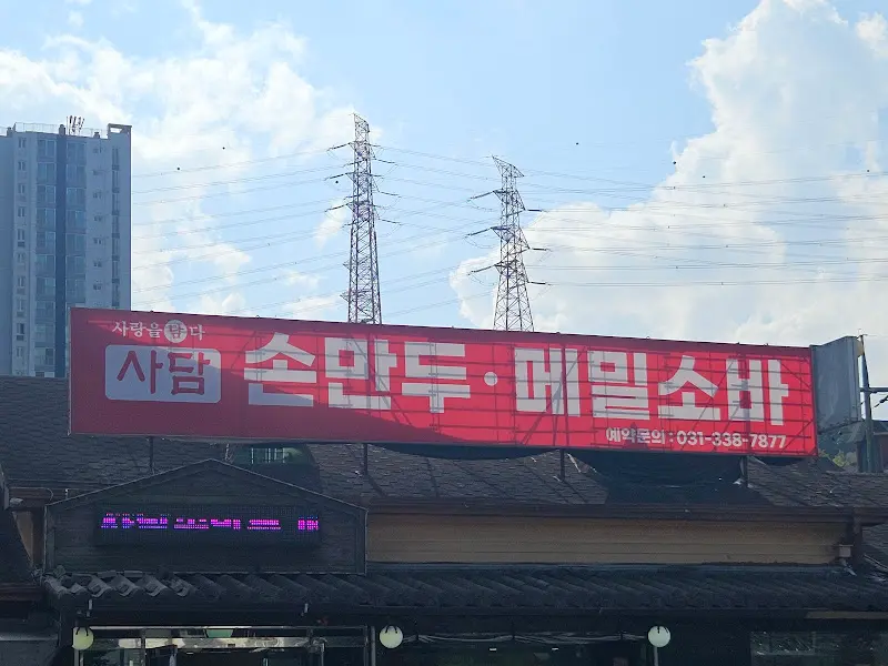 드디어 벼르고 벼르던 용인 사담손만두 방문! 두근거리는 마음을 안고 차를 몰아 용인시청 근처, 두산위브 아파트 입구 안쪽에 자리 잡은 사담손만두로 향했다. 간판에 큼지막하게 써진 “사담 손만두・메밀소바”라는 글자가 왠지 모르게 맛집 포스를 풍기는 것이, 오늘 제대로 된 곳을 찾아왔다는 확신이 들었다. 하늘 높이 솟은 송전탑 아래, 빨간색 간판이 강렬하게 눈에 띄는 외관부터가 심상치 않았다. 주차장이 좁다는 정보를 입수하고 오픈 시간 맞춰서 갔는데도 이미 차들이 꽉 차 있었다. 역시 맛집은 맛집인가 보다.