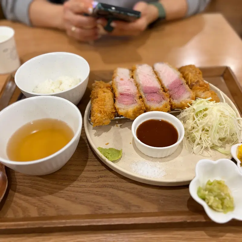 오픈 시간에 맞춰 도착했음에도 불구하고, 이미 가게 안은 손님들로 북적였다. 나무 소재를 사용한 따뜻한 분위기의 인테리어는 편안함을 주었고, 은은하게 풍기는 음식 냄새는 우리의 식욕을 자극했다. 자리에 앉자마자 시원한 녹차 물이 나왔는데, 은은한 녹차 향이 입안을 개운하게 만들어 주어 식사 전부터 기분이 좋아졌다. 나는 이곳의 대표 메뉴인 안심 카츠와 붓카케 우동 세트를 주문했다. 친구는 치즈 카츠와 미니 우동 세트를 선택했다.
