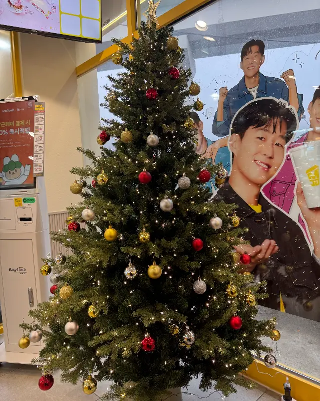 매장 한쪽에는 크리스마스 트리가 떡하니 자리 잡고 있었는데, 빨간색, 금색, 은색 오너먼트들이 반짝반짝 빛나는 게 너무 예뻤어요. 특히 트리 꼭대기에 달려있는 커다란 별 장식이 눈에 띄었는데, 괜히 저도 모르게 크리스마스 분위기에 흠뻑 빠져들었답니다.