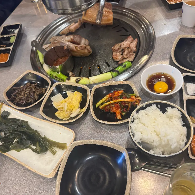 드디어, 잘 익은 꽃목살 한 점을 집어 계란 간장 소스에 푹 찍어 입안으로 가져갔다. 🤤 그 순간, 눈이 번쩍 뜨였다. 입안 가득 퍼지는 풍부한 육즙과 부드러운 식감은 그야말로 환상적이었다. 계란 간장 소스의 고소함과 짭짤함이 더해져, 고기의 풍미를 한층 끌어올렸다. 파김치와 함께 먹으니, 매콤하면서도 시원한 맛이 느끼함을 잡아주어 더욱 맛있게 즐길 수 있었다. 친구가 왜 이곳을 강력 추천했는지, 단번에 이해가 되는 맛이었다.