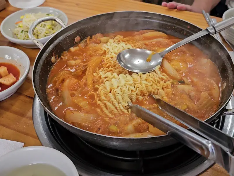 주문 후 얼마 지나지 않아, 테이블 위에는 푸짐한 두루치기 한 냄비가 놓였다. 냄비 안에는 큼지막한 돼지고기와 김치가 듬뿍 들어 있었고, 걸쭉한 국물이 자작하게 끓고 있었다. 갓 삶아져 나온 라면사리를 추가하니, 그 비주얼은 더욱 먹음직스러워졌다. 함께 나온 반찬은 깍두기, 콩나물, 그리고 구운 김. 소박하지만 두루치기와 환상적인 조합을 이룰 반찬들이었다. 특히, 김을 구워 내어주는 점이 인상적이었다.