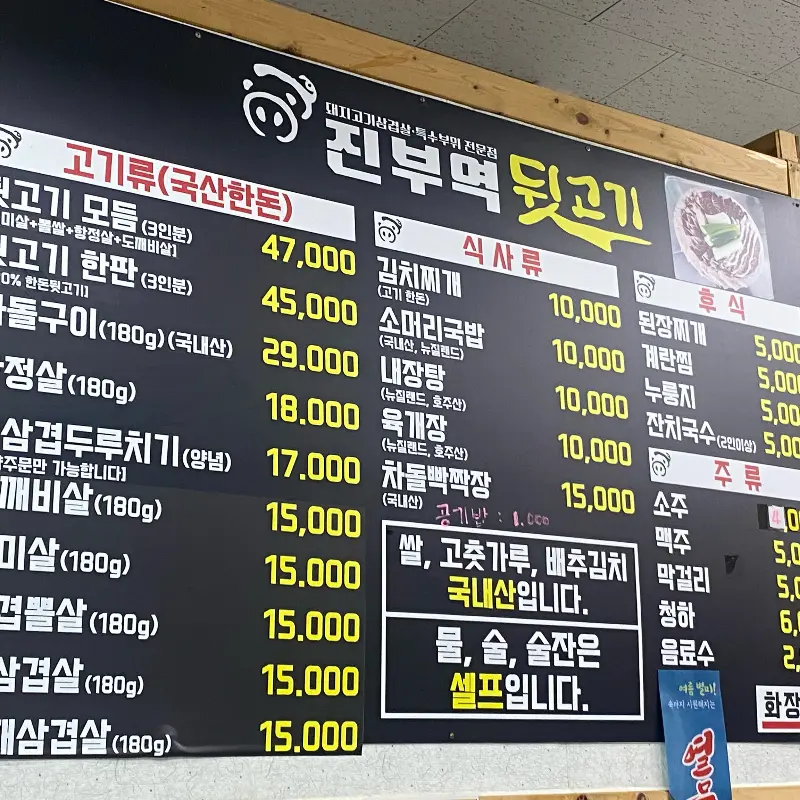 진부역에서 그리 멀지 않은 곳에 위치한 식당은, 소박하지만 정겨운 분위기를 풍겼다. 메뉴판을 보니 뒷고기 모둠을 비롯해 덜미살, 뽈살 등 다양한 부위의 고기를 맛볼 수 있다고 한다. 우리는 뒷고기 모둠을 주문했다. 잠시 후, 숯불이 들어오고, 곧이어 푸짐한 한 상이 차려졌다.
