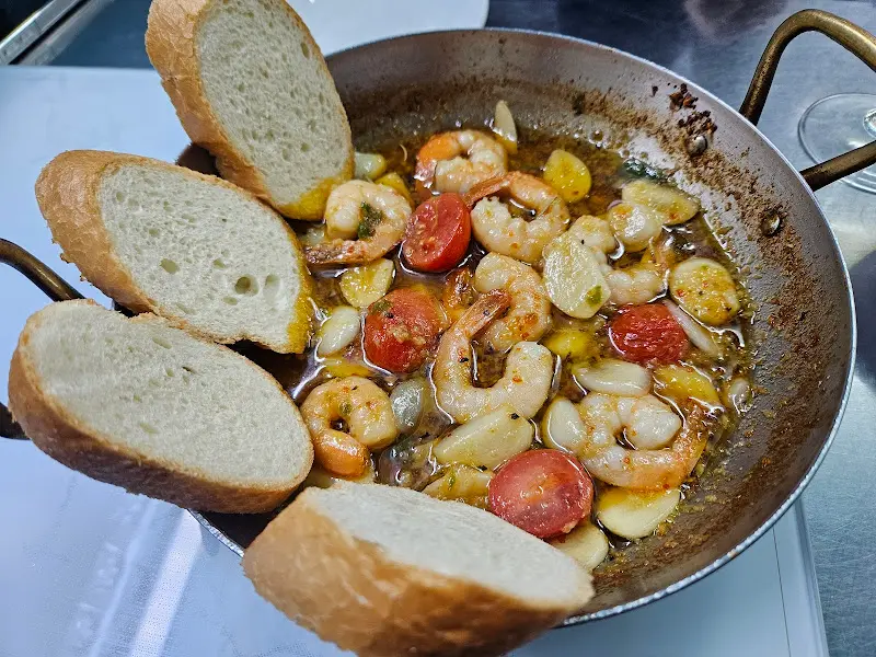 잠시 후, 기다리던 감바스 알 아히요가 테이블 위에 놓였다. 뜨겁게 달궈진 팬에서 올리브 오일이 지글거리는 소리와 함께 마늘과 새우의 향긋한 향이 코를 자극했다. 에서 볼 수 있듯이, 통통한 새우와 붉은 토마토, 바삭하게 구워진 빵이 시각적인 즐거움까지 더했다. 빵을 올리브 오일에 듬뿍 적셔 한 입 베어 물자, 입 안 가득 퍼지는 마늘의 풍미와 새우의 감칠맛이 혀를 황홀하게 만들었다. 160도에서 마이야르 반응이 일어난 빵 표면은 바삭한 크러스트를 형성하여 식감의 재미를 더했다.