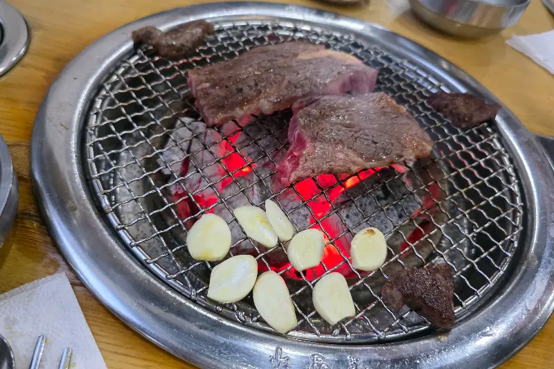 잘 구워진 등심 한 점을 입에 넣는 순간, 뇌의 쾌락 중추가 활성화되는 것을 느꼈습니다. 풍부한 육즙이 입안 가득 퍼지면서, 복잡한 향미가 코를 자극했습니다. 글루타메이트와 이노시네이트의 환상적인 조합은 감칠맛을 극대화했고, 적절한 지방 함량은 부드러운 식감을 선사했습니다. 마치 오케스트라의 협주곡처럼, 모든 요소가 완벽하게 조화를 이루는 맛이었습니다. 곁들여 나온 마늘 역시 알리신 성분이 숯불에 구워지면서 매운맛은 사라지고 단맛이 극대화되어, 고기의 풍미를 더욱 돋보이게 했습니다. 에서 보이는 구워진 마늘은 단순한 조연이 아닌, 훌륭한 조력자였습니다.