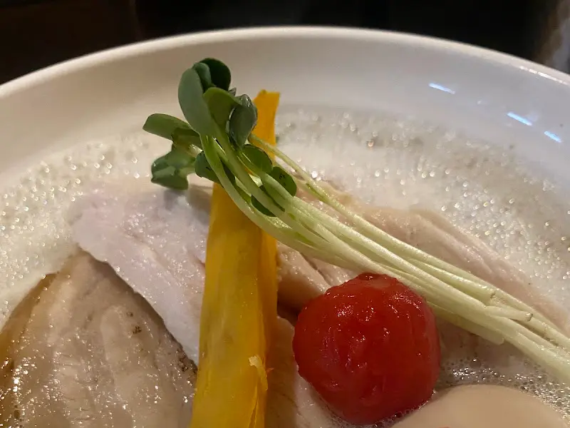 드디어 기다리고 기다리던 백탕면 등장! 비주얼부터 심상치 않다. 뽀얀 국물 위에 닭고기 차슈, 돼지고기 차슈, 그리고 특이하게 방울토마토랑 단호박이 올라가 있다.