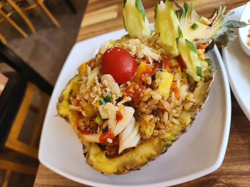 잠시 후, 먹음직스러운 파인애플 볶음밥이 테이블 위에 놓였다. 파인애플의 속을 파내 그 안에 볶음밥을 담아낸 모습이 시각적으로도 훌륭했다. 볶음밥 위에는 붉은 토마토와 신선한 오이 조각이 얹어져 있었고, 볶음밥 자체는 윤기가 자르르 흘렀다. 한 입 맛보니, 파인애플의 달콤함과 볶음밥의 고소함이 절묘하게 어우러졌다. 밥알 하나하나에 코팅된 듯한 풍미는 입안 가득 퍼져 나갔다. 씹을 때마다 느껴지는 파인애플의 과즙은 볶음밥의 맛을 한층 더 풍부하게 만들어 주었다.