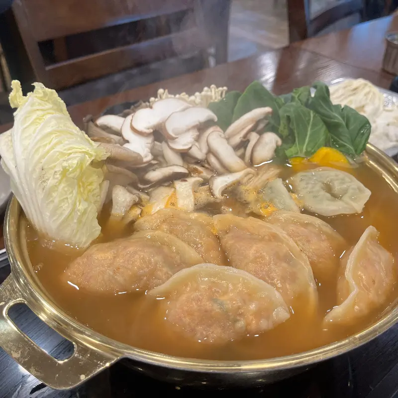 에서 보았던 만두전골은 그야말로 장관이었다. 뽀얀 김을 뿜어내는 육수 위로, 김치만두, 고기만두, 갈비만두가 푸짐하게 담겨 있었다. 신선한 배추와 버섯, 갖가지 채소들이 형형색색의 조화를 이루며 식욕을 자극했다. 넉넉한 인심이 느껴지는 푸짐한 양에 절로 미소가 지어졌다.