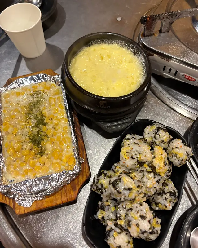 날치알 주먹밥도 진짜 맛있었다. 동글동글 귀여운 모양새도 맘에 들었고, 톡톡 터지는 날치알 식감도 최고였다. 닭갈비 양념에 슥슥 비벼 먹으니까, 완전 꿀맛! 그리고 콘치즈… 하… 이건 진짜 사랑입니다. 달콤하고 고소한 콘치즈를 숟가락으로 푹 떠서, 닭갈비랑 같이 먹으면… ㅠㅠㅠ 천국이 있다면 바로 여기일 거야.
