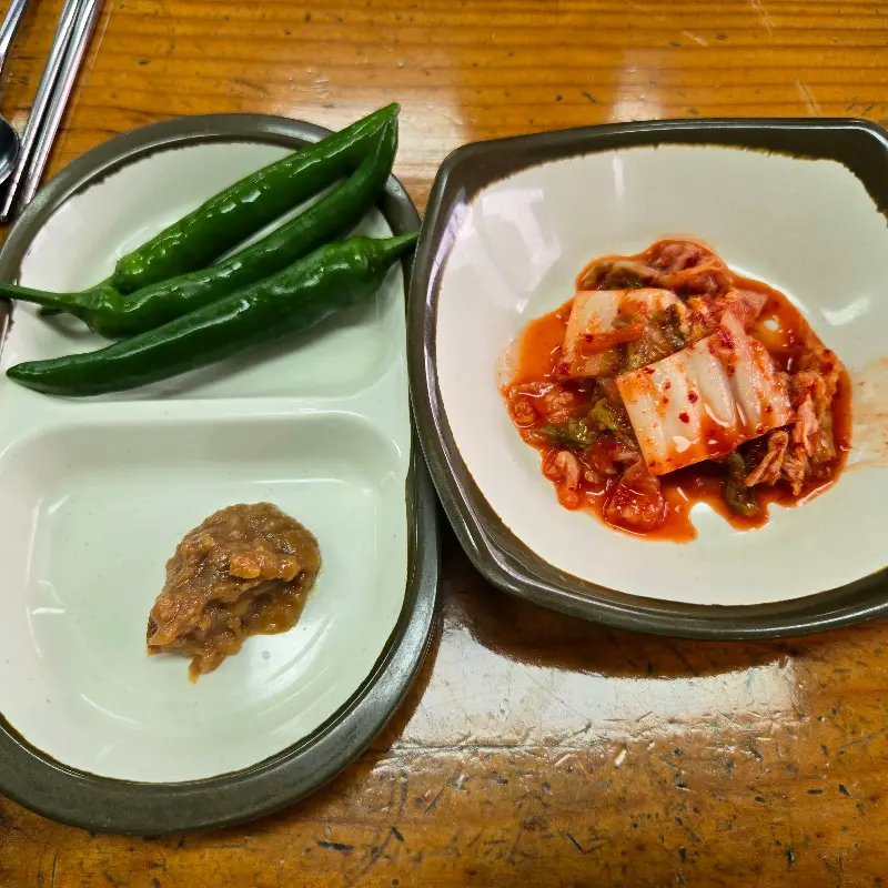 고민 끝에 잔치국수 하나, 비빔국수 하나, 그리고 사이드로 감자만두까지 야무지게 주문 완료! 주문하자마자 사장님께서 큼지막한 쟁반에 기본 반찬을 턱, 하고 놓아주시는데… 인심 무엇? 넉넉하게 담긴 김치와 풋고추, 그리고 쌈장까지! 특히 저 김치는 딱 봐도 직접 담근 손맛이 느껴지는 비주얼이었다. 살짝 맛을 보니, 적당히 익어서 시원하면서도 칼칼한 맛이… 이거 완전 국수랑 찰떡궁합일 것 같은 예감이 팍팍 들었다.