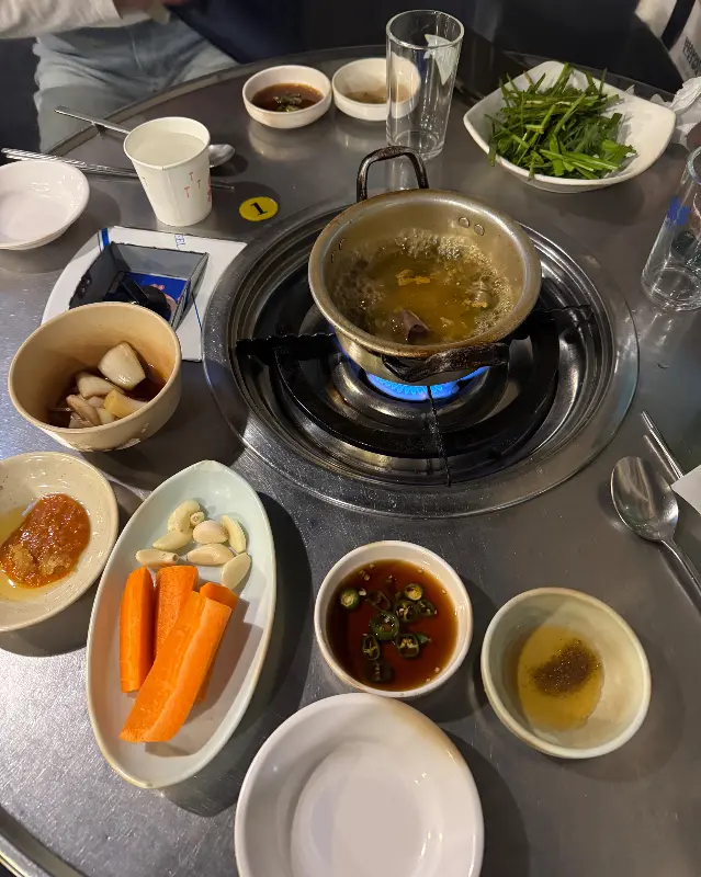 주문하고 나니 밑반찬이 쫙 깔리는데, 이것부터 심상치 않아. 특히 뜨끈한 선지해장국! 이거 진짜 술안주로 딱이야. 칼칼하면서 시원한 국물이, 곱창 나오기 전에 소주 한 병 순삭 할 기세. ㅋㅋㅋ 밑반찬으로 나오는 깻잎 장아찌도 곱창이랑 같이 먹으면 진짜 환상의 조합이거든.