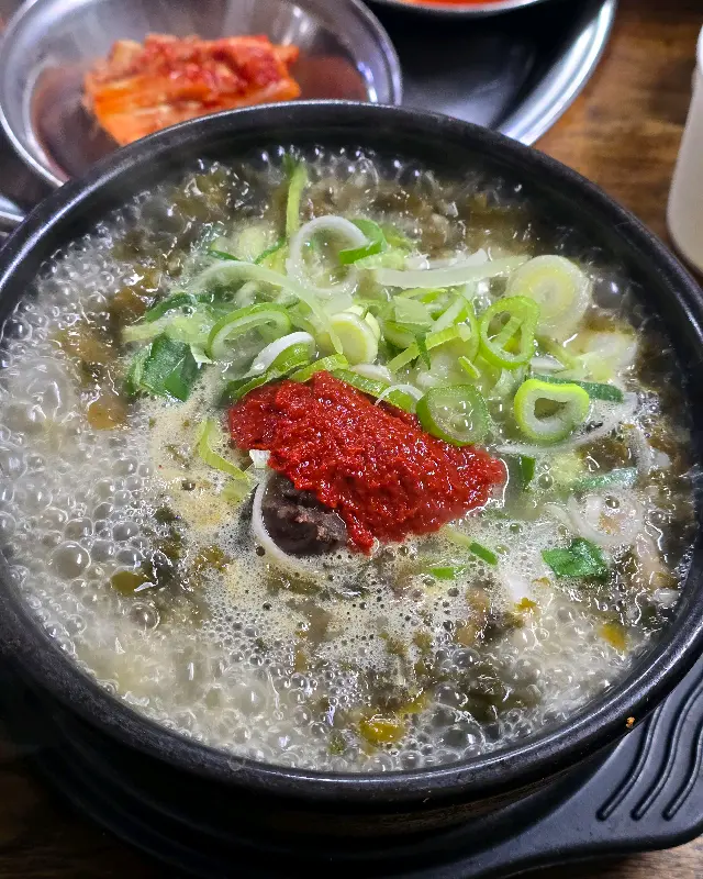 드디어 기다리고 기다리던 순대국 등장! 뚝배기 안에서 보글보글 끓는 모습이 진짜 예술이었다. 국물 위에 송송 썰린 파와 다진 양념이 얹어져 있는데, 비주얼부터가 이미 합격이었다. 얼른 숟가락을 들고 국물을 한 입 딱 떠먹었는데… 와, 이거 진짜 미쳤다! 잡내 하나 없이 깔끔하면서도 깊은 맛이 느껴지는 국물이었다.